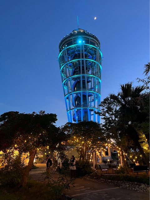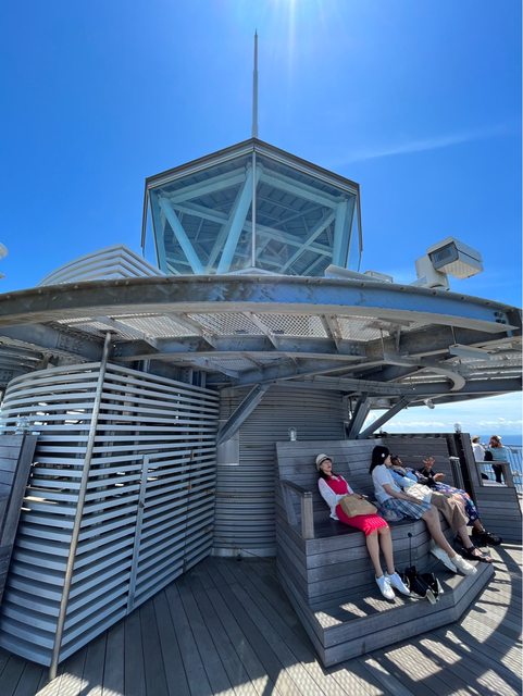 搭電梯上去燈塔頂端,室內空間有冷氣,也可再爬一層樓梯到戶外區域,有遮陽座位區、