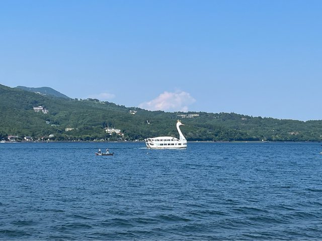 遠眺山中湖的天鵝遊覽船。