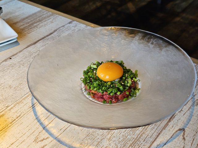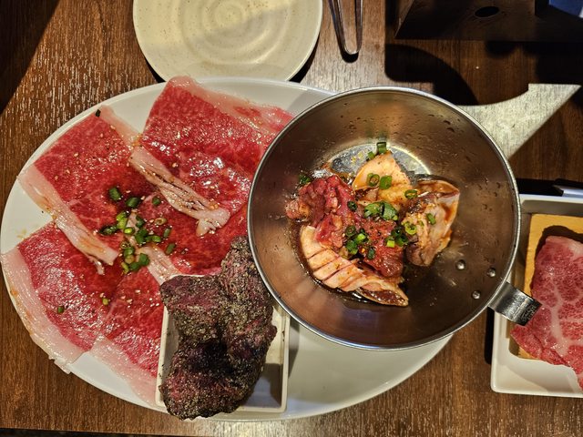 牛肋條是一整條送上,桌上有剪刀邊烤邊剪像韓式烤肉,醃製的很入味,好吃。