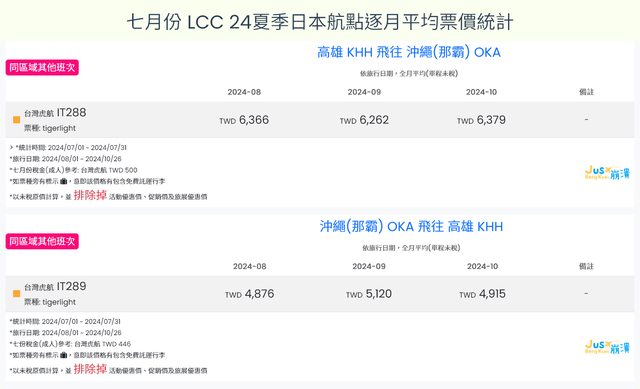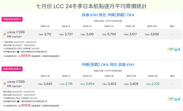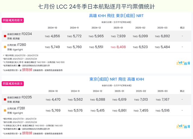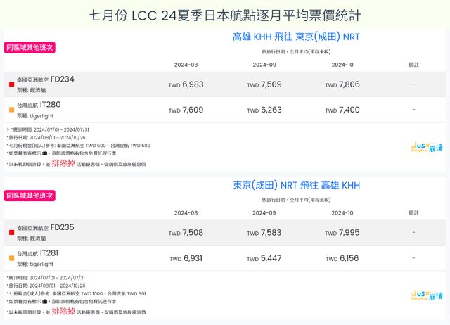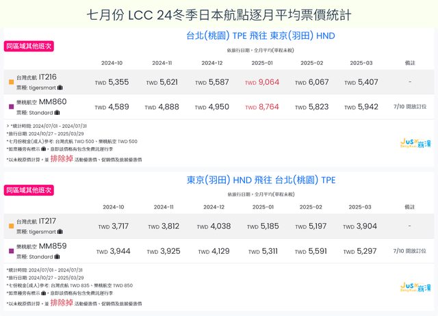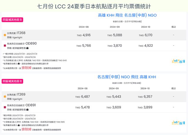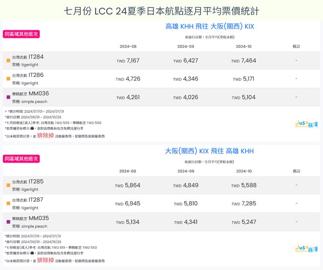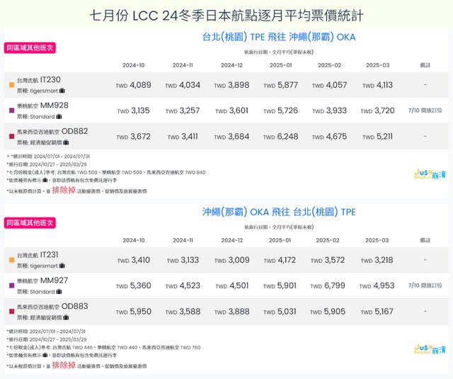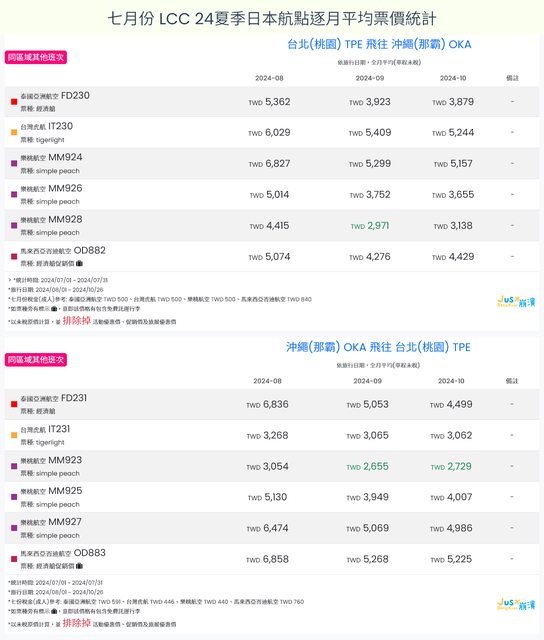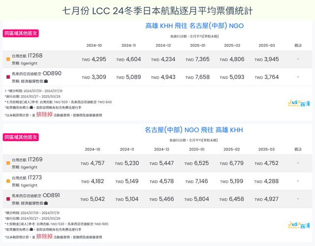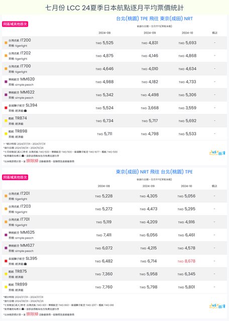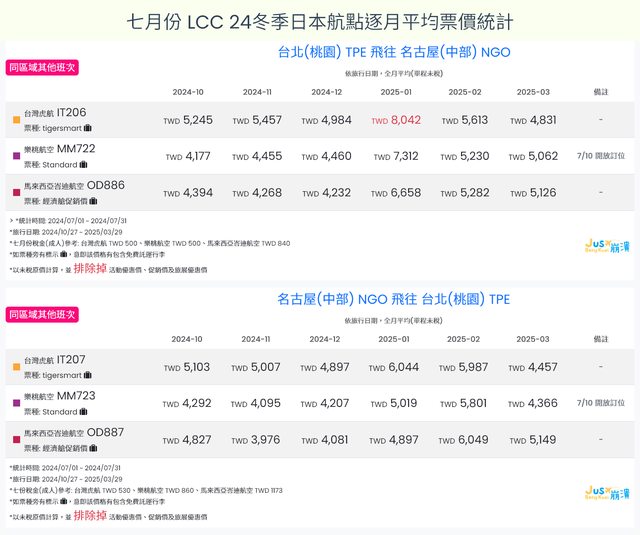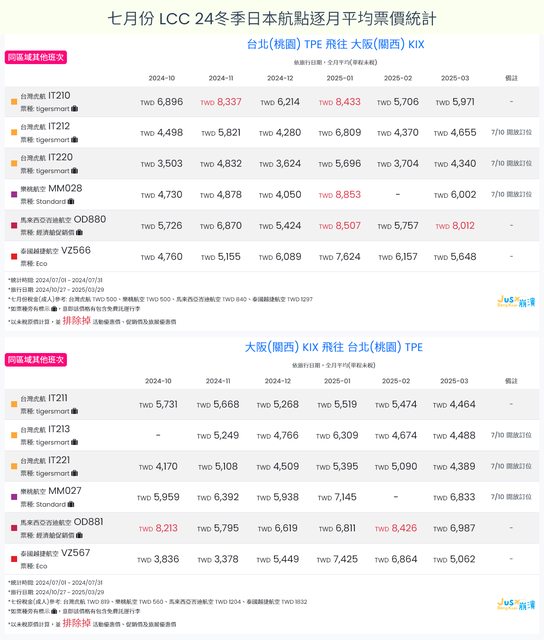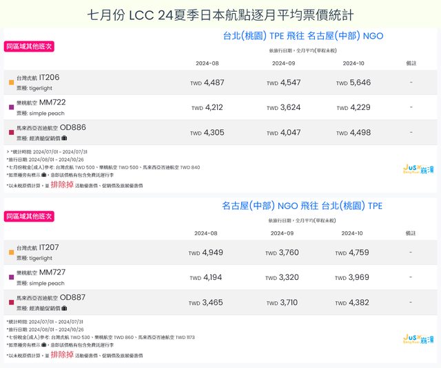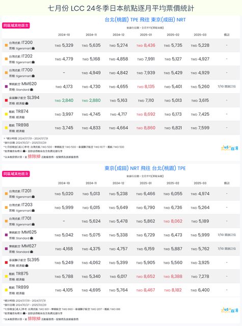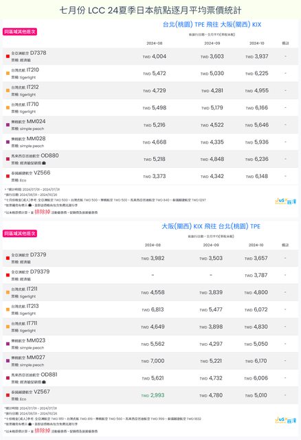 標題[分享] 7月LCC 24夏、24冬日本航點逐月均價統計