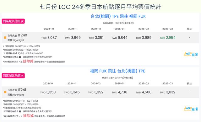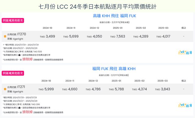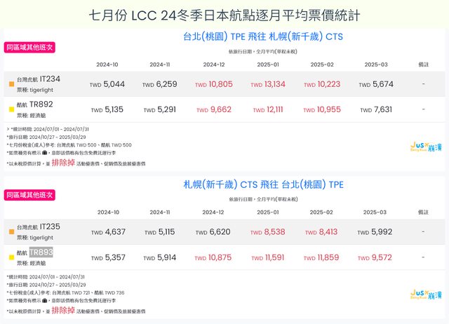 由於各業者在七月陸續開放冬季班表訂位,就開放訂位初期而言,價格波動時大時小