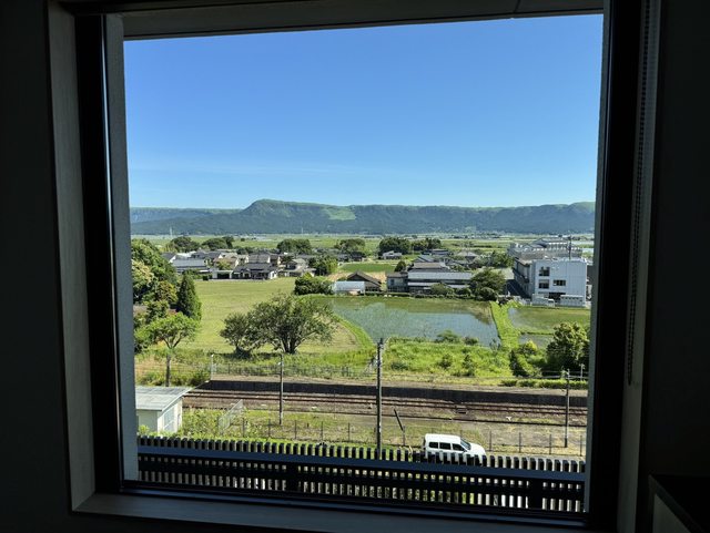 窗外右下角就是阿蘇車站了,可以看到很多列車往來。這台紅色的列車應該是九州橫斷特