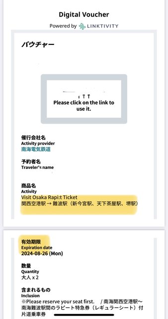 1. 讓售品項:南海電鐵特急 Rapi:t車票 關西機場-難波