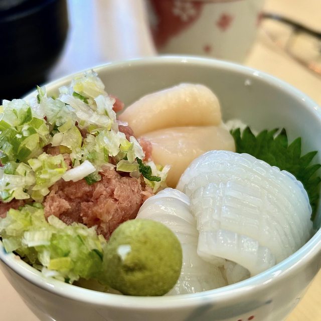 自己選擇三樣材料的小碗丼飯,這次選擇烏賊干貝及蔥花鮪魚,柔軟鮮甜的生魚片搭配白