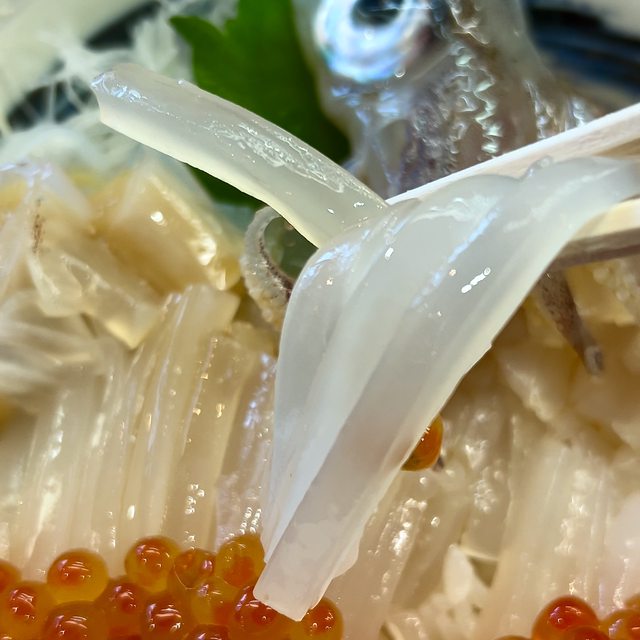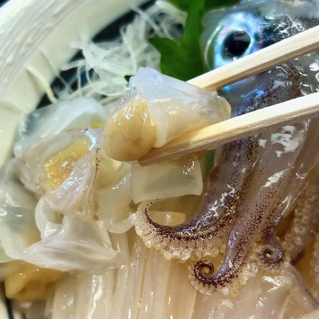 脆彈牙,內臟宛如液態鵝肝醬濃稠,鮮而不腥,觸手部分較硬,越咬越能得到烏賊的鮮甜