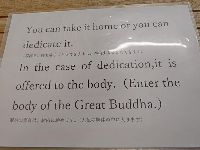 寫好的經文將於每年的08月07日大佛洗澡的時候奉納到大佛胎內