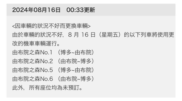 標題Re: [資訊] 8/16由布院之森更換車輛
