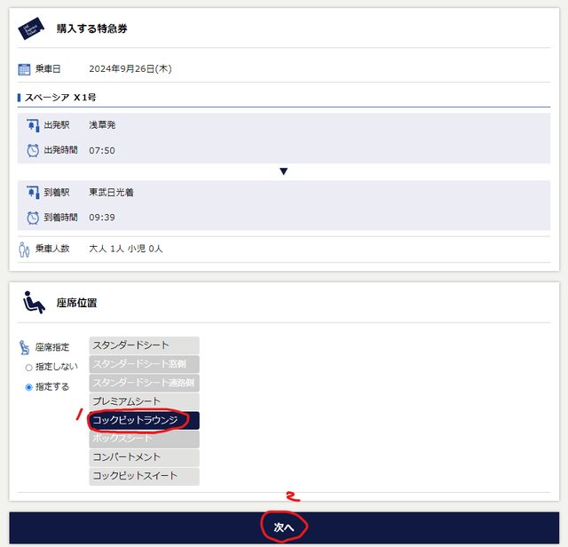 點擊購入後 就會到選座位種類的畫面 我們這裡就選Cockpit lounge