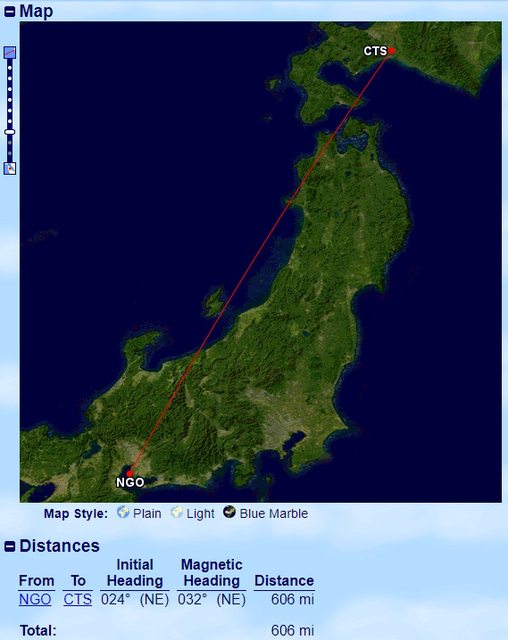 名古屋到札幌距離為606 miles,預計飛行時間為1小時45分鐘。