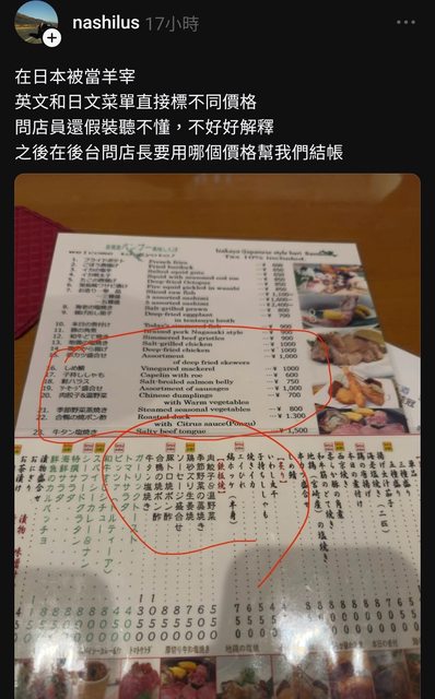 → blueslovetw : 比著菜單的照片,結帳時價格卻多兩百日幣,還是女 09/03 00:53