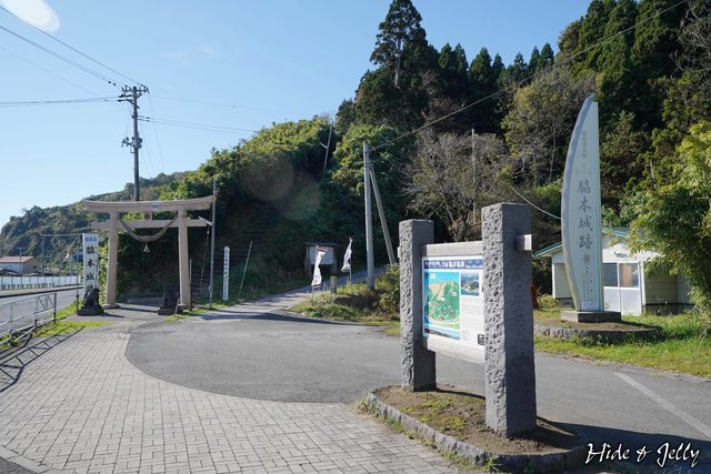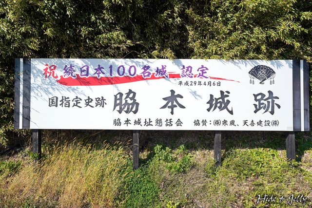 路旁可以看到脇本城跡慶祝續日本100名城認定的看板,右邊還有安東氏的家紋「檜扇に