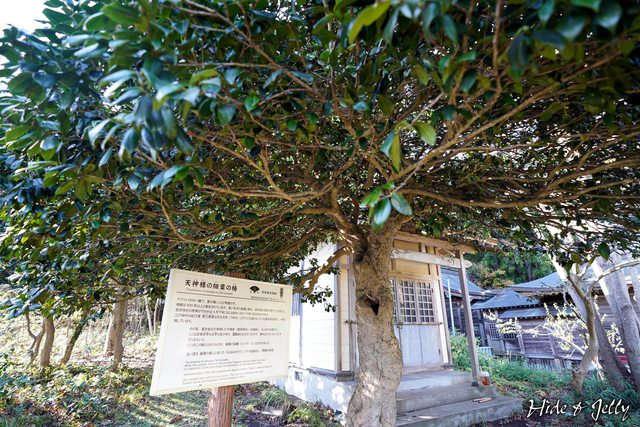 菅原神社前方,有一棵男鹿市指定天然紀念物的「細葉の椿」(細葉山茶花),推定樹齡