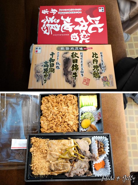 我們買了一個單純比內地雞飯,另一個則是豪華的雞牛豬便當,再搭上開回秋田的電車上