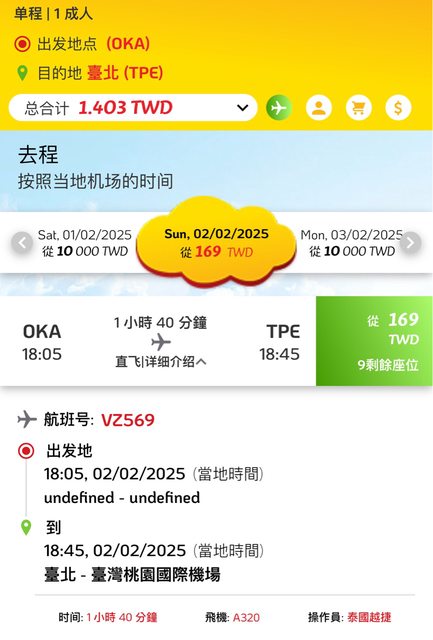 2/2沖繩飛桃園單程未稅$169、含稅$1403