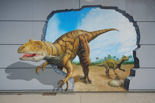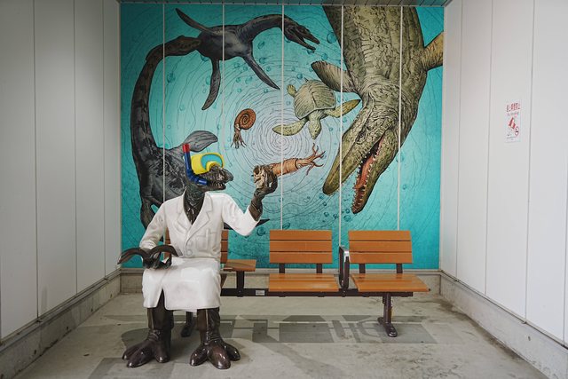 再走回車站,巴士站這一側的牆壁上繪製了破牆的恐龍。嗯..普通