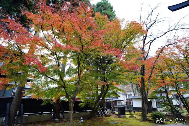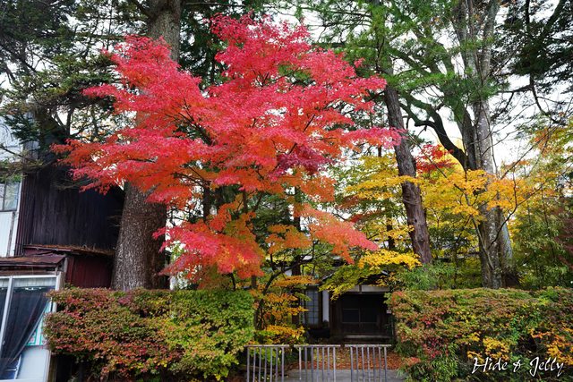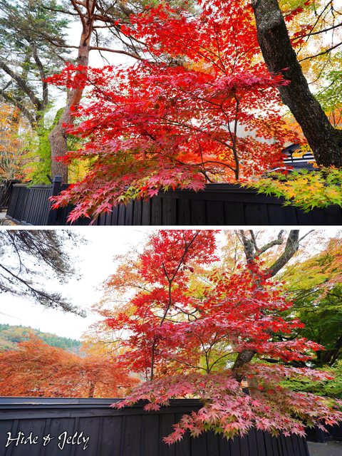 走出青柳家,看到青柳家的南門外牆,也有爆滿的楓葉,真的相當厲害啊。