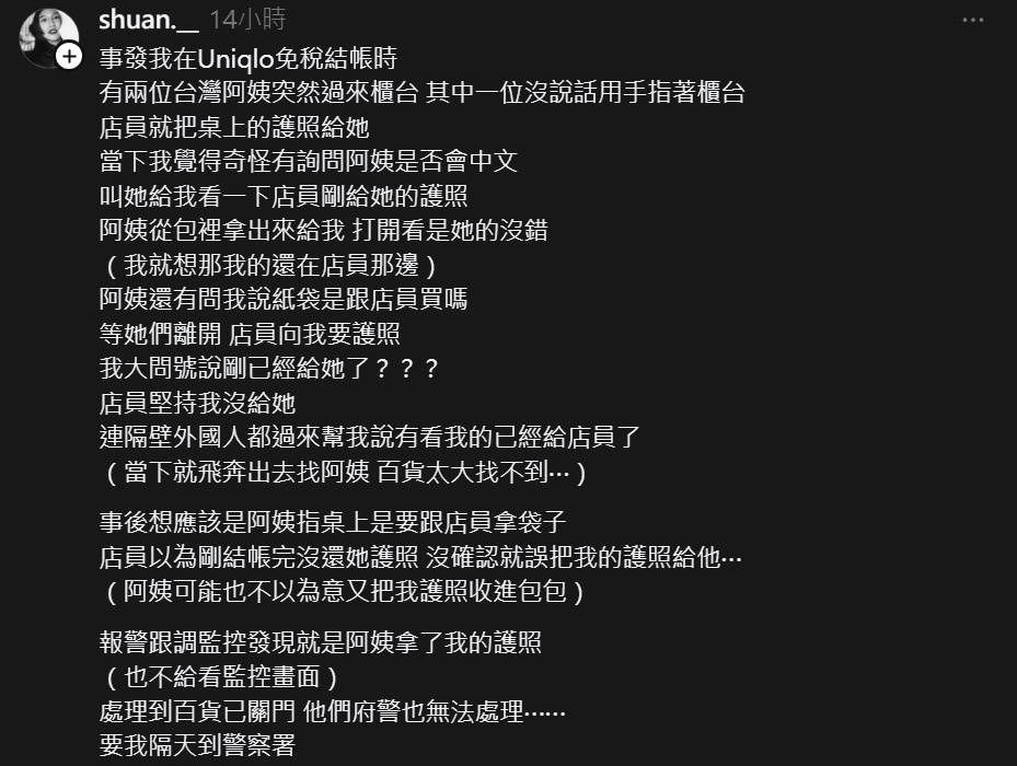 → shanyaochung: 失主有說店員跟她要護照的時候,她才發現店員拿給 09/24 23:10