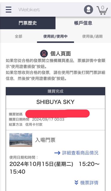 1. 讓售品項:113/10/15 shibuya sky門票*2
