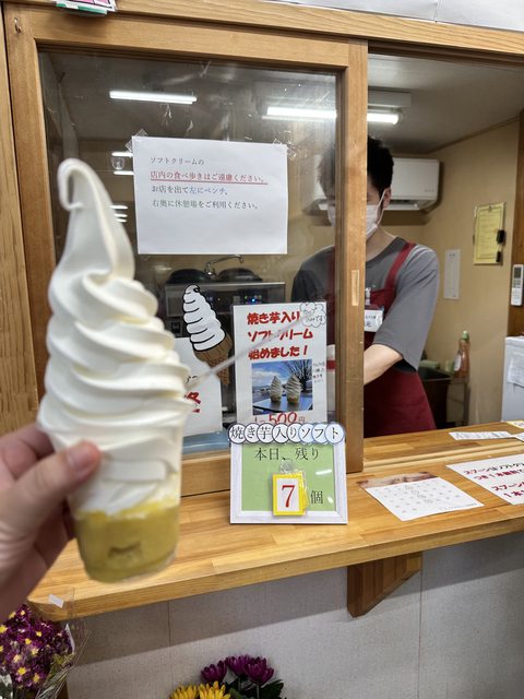 休息站的名產是人手一支的超大冰淇淋 我點的是每日數量限定有加烤地瓜版本所以冰淇淋量比較少了一點