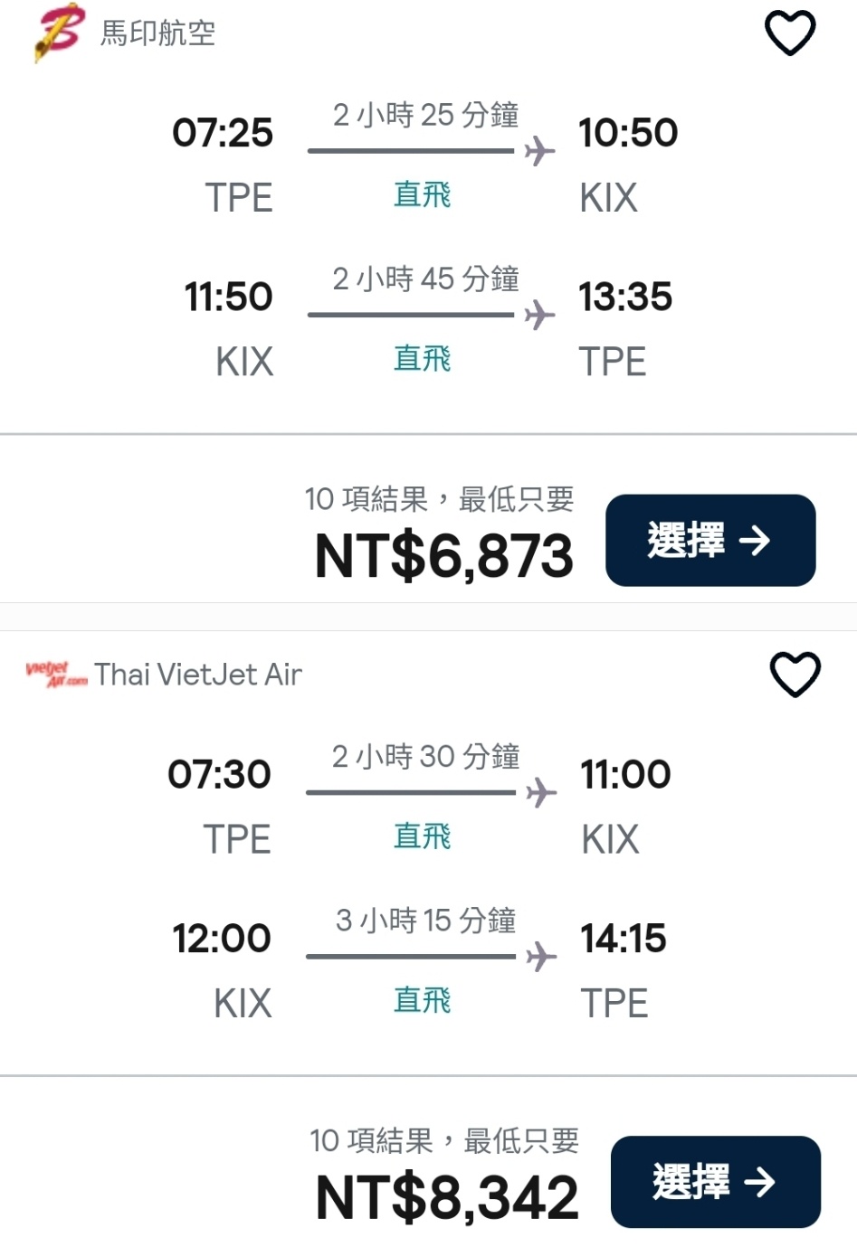 大阪航線單程最便宜有到台幣1113元(未稅)