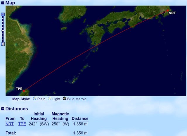 東京成田到台北距離為1356miles,預計飛行時間為3小時40分鐘。