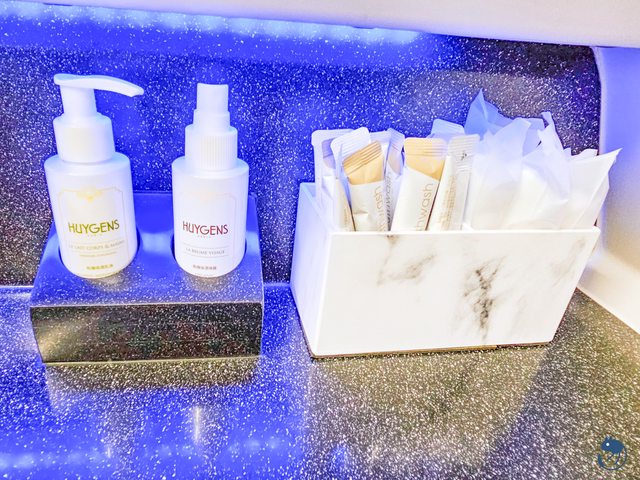 保濕乳液與保濕噴霧是來自法國的香氛保養品牌-Huygens。旁邊擺的是漱口水、牙線棒與