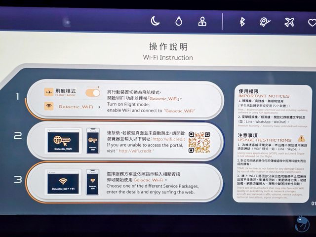 頭等與商務艙乘客可以全程免費使用機上WIFI,豪經艙與經濟艙旅客則是開放文字訊息。