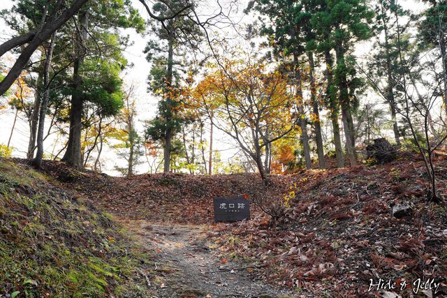 走著走著,突然看到有很新的木製標示「虎口跡」,兩旁有土壘,還有不少石垣散落,看