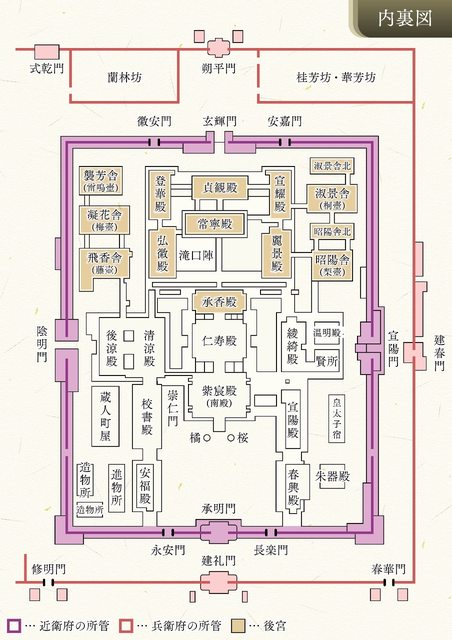 妃則住在「大內裏」的「內裏」之中。內裏中,以仁壽殿與承香殿之間為邊境,南邊是處