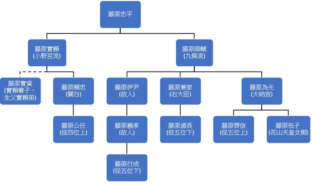 中與道長關係最遠的是公任,共同祖先是三代前的曾祖父藤原忠平。倒是藏人頭藤原實資