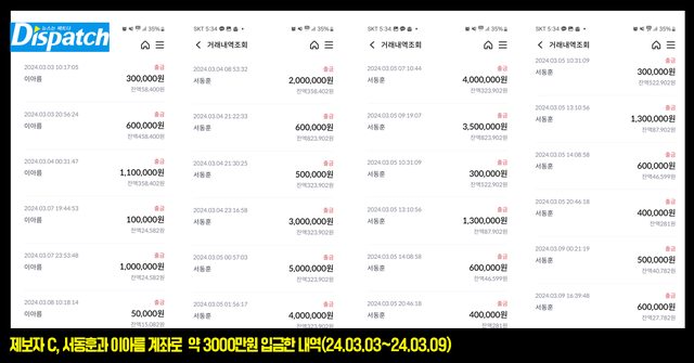 Dispatch取得了C某的存摺明細,C某先後賄款給雅凜315萬韓元,