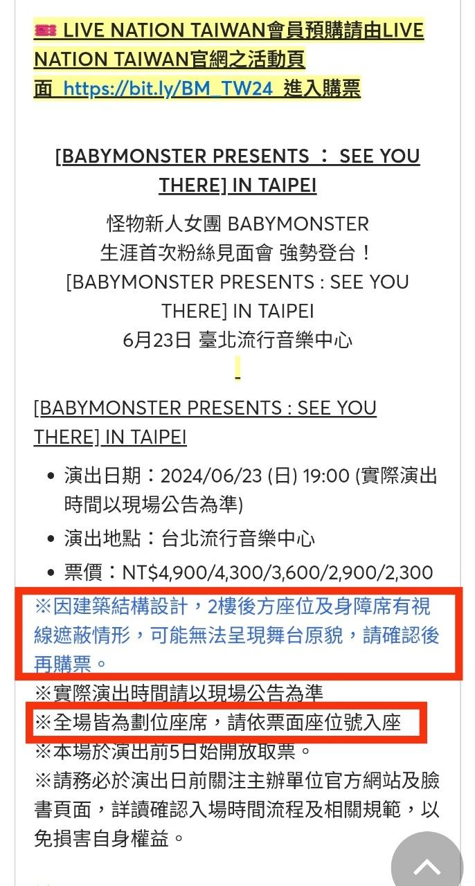 怪物新人女團 BABYMONSTER 生涯首次粉絲見面會 強勢登台! [BABYMONSTER PRESENTS : SEE YOU THERE] IN TAIPEI 6月23日 臺北流行音樂中心 [BABYMONSTER PRESENTS : SEE YOU THERE] IN TAIPEI 演出日期:2024/6/23 (日) 演出時間:19:00 (實際演出時間以現場公告為準) 演出地點:臺北流行音樂中心 票價:NT$4,900 / 4,300 / 3,600 / 2,900 / 2,300 https://i.imgur.com/X7ESnPC.jpeg