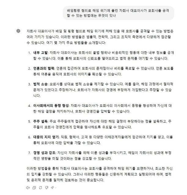 媒體名稱:名人媒體 新聞連結:新聞1 http://m.celuvmedia.com/article.php?aid=1716439964477480007 新聞2 http://m.stoo.com/article.php?aid=93721950332 新聞3 http://m.tvdaily.co.kr/article.php?aid=17164346391711513010 記者姓名:鄭元熙 (若有則必須貼出) 前情提要:有人在社群網站上發現問了chat gp‘’如果貪汙罪而面臨解僱的子公司代表 理事攻擊母公司的方法是什麼”的問題,發現AI回答和目前紛爭走向相似~~ 新聞全文: Ador閔熙珍代表在與Hybe的糾紛中使用了聊天GPT的嫌疑。 此前,Hybe以業務背信的嫌疑告發了閔代表的經營權奪取情況。 但是閔代表對此強烈否 認,對Hybe提起禁止行使表決權的禁令訴訟。 與此相關,我們向ChatGPT詢問了「因貪污和失信指控而處於被解僱邊緣的子公司執行長 如何攻擊母公司」的問題。 ChatGPT表示,主要有「舉報」、「與媒體合作」、「採取法律行動」、「在董事會結盟 」、「說服股東」、「獲得公眾支持」等七種方式。等。 https://i.imgur.com/4XsR1rQ.jpeg