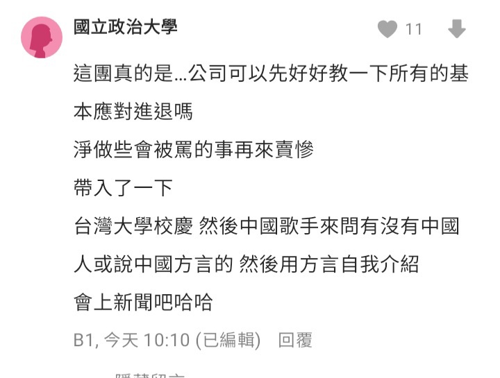 → a31324285: 政大閔粉又開秀了XD 101.12.24.100 05/26 11:00