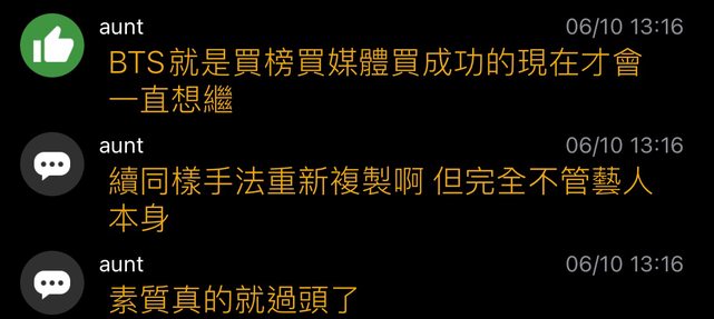 推 see1994: 第五個aunt有疑慮 說bts影射藝人買榜操 36.236.195.187 06/18 00:44