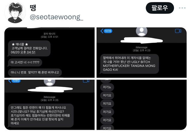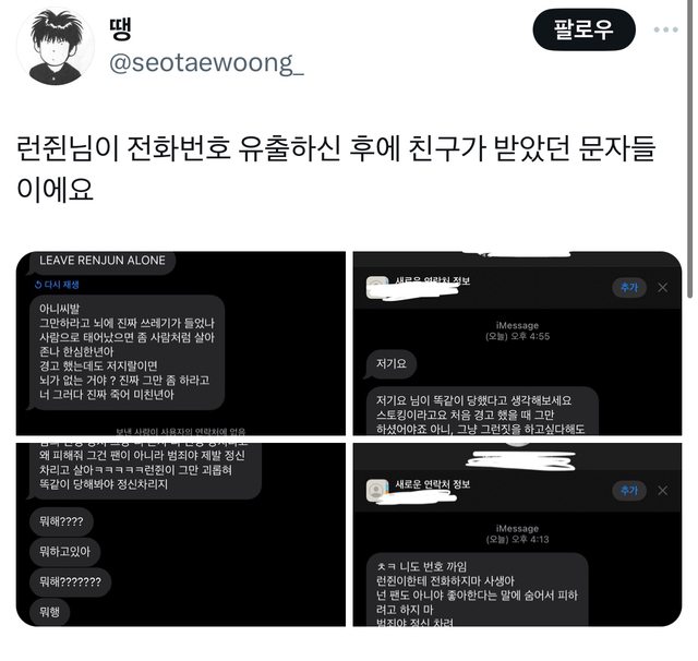 https://x.com/seotaewoong_/status/1803778082513494073 目前bubble仁俊發的號碼的截圖已經被拿掉了 韓評 1. 禍是自己闖的,結果是經紀人出來道歉,還真好笑..受害者就直接提告吧 2. 連確認都不確認就公開電話號碼?太沒想法了吧,受害者有什麼罪啊 3. 道歉然後賠償啊,這是在幹什麼啊,洩露個資還虛假事實誹謗 4. 私生應該是用不顯示電話打的,但這位是因為用真電話打過去所以直接被公開 5. 有可能是私生所以沒辦法親自道歉是什麼鬼kkk是天龍人嗎?有錯的話本人就要道歉啊 https://theqoo.net/square/3286783353 -- ※ 發信站: 批踢踢實業坊(ptt-site.org.tw), 來自: 182.233.148.90 (臺灣) ※ 文章網址: https://ptt-site.org.tw/KoreaStar/M.1718903510.A.4AE