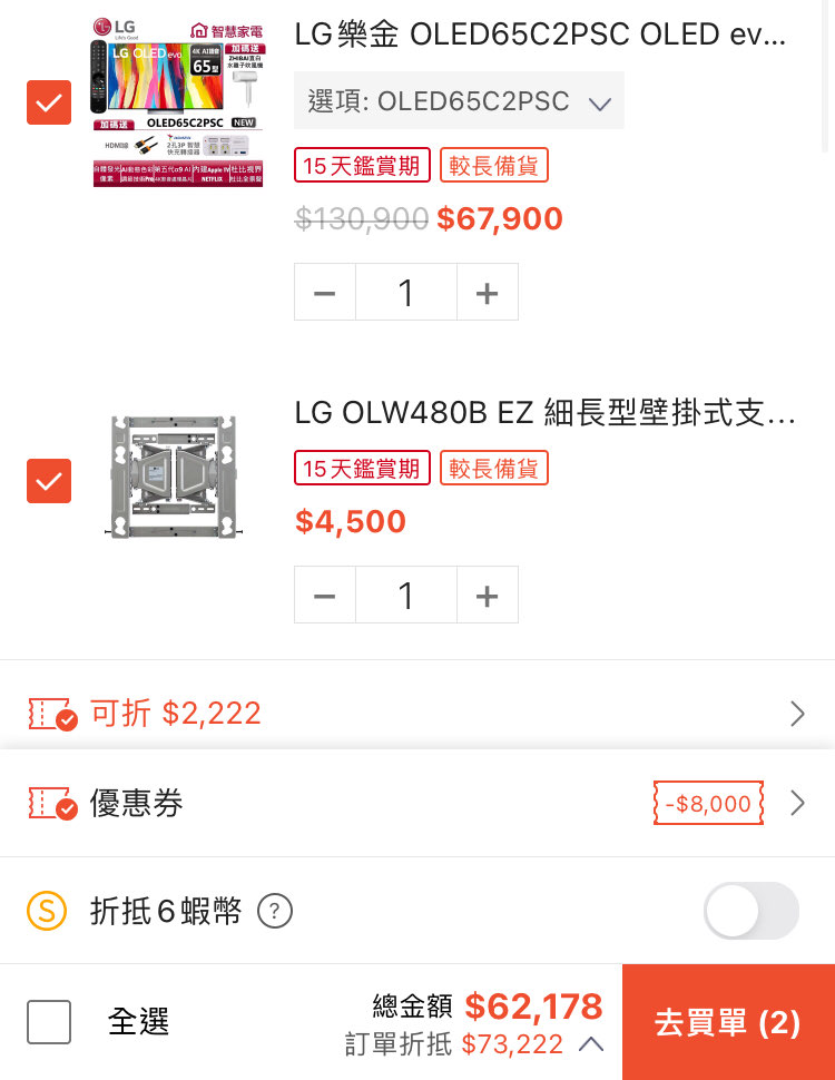 推 deray: 65C2+壁掛架=62,178 -> 電視57,678118.165.169.253 06/30 12:55
