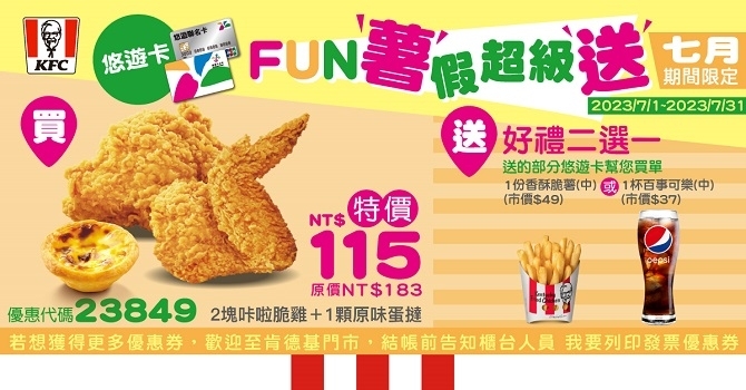 推 thoms: 23526 蛋塔x2 + 炸雞x3 = 149, 今天還可用 36.226.227.84 07/01 20:21