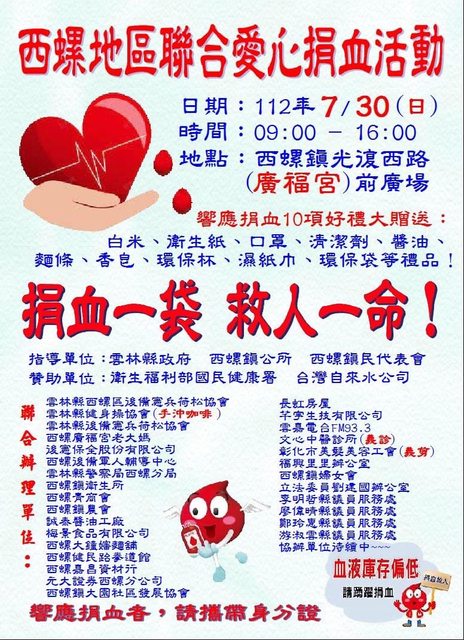 7/30(日):雲林西螺鎮廣福宮前廣場 09:00~16:00 送白米、衛生紙、口罩等生活好禮