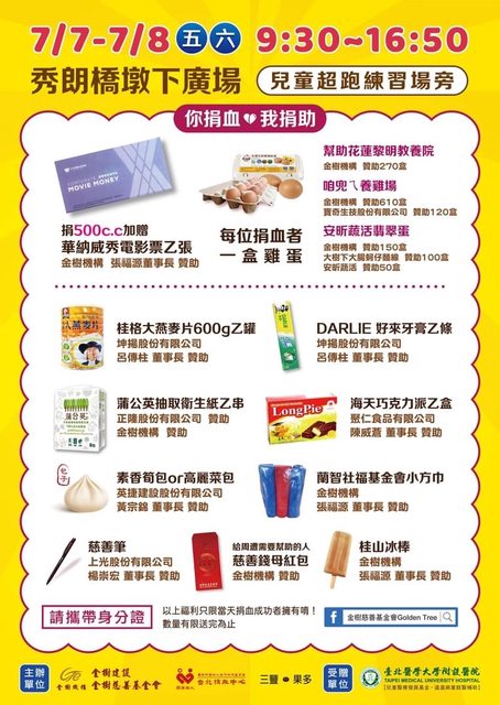 7/7~8(五和六):新北秀朗橋墩下廣場 09:30~16:50 送雞蛋、大燕麥片、衛生紙等好禮