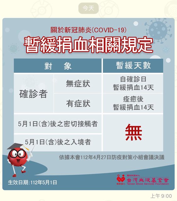 ⊙新冠肺炎暫緩捐血相關說明(112/5/1最新發布)