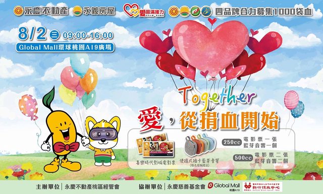 8/2(週三):Global Mall環球桃園A19廣場 09:00~16:00 送電影票、藍牙音響/加倍送