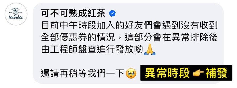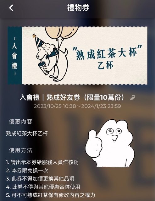 推 abeabeabe: 剛加入,只收到4張券,沒有免費紅茶券 36.232.151.94 10/26 02:50