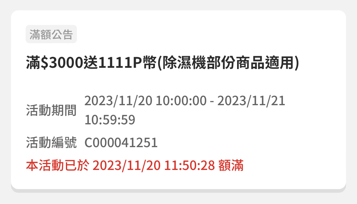 1. 滿2400登記送124P幣(APP限定) (消費時間11/20 11:00-11/21 10:59、登記時間11/21 15:00-11/21 23:59) 2. 全站指定品滿額1500送3%P幣(上限300P幣/限量) 活動期間:11/20-24 20:00- 23:59 3. 全站指定滿3萬送2.5%P幣(最高750P幣/限量) 活動時間:11/24 11:00-12:59 4. 百貨指定品滿2000送200P幣 活動時間:11/24限定 另外這邊特別提一下,每月20號是除濕日,今天買以下牌子的除濕機滿3000就送1111P幣 威技 https://reurl.cc/A0rqyE 家佳寶 https://reurl.cc/Do29md 惠而浦 https://reurl.cc/QZqd45 LG https://reurl.cc/NyMjqm 禾聯 https://reurl.cc/m0OnlV 日立 https://reurl.cc/y68Z7y 對於需要基本功能除濕機的人來說大概一台4、5000的就ok了,可以再拿1111P幣算真的有 省 以上分享 -- ※ 發信站: 批踢踢實業坊(ptt-site.org.tw), 來自: 118.161.122.203 (臺灣) ※ 文章網址: https://ptt-site.org.tw/Lifeismoney/M.1700488934.A.CCD