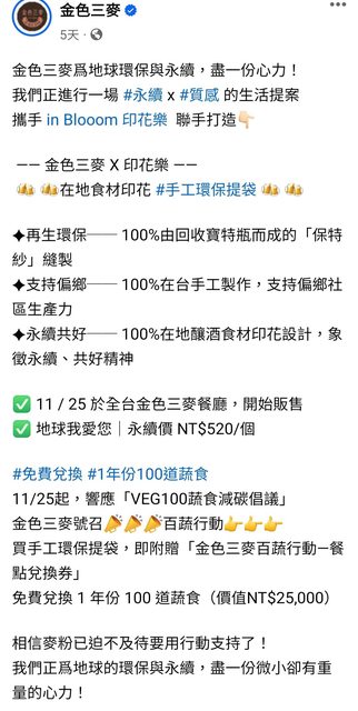 買NT$520手工環保提袋, 附贈「金色三麥百蔬行動—餐點兌換券」 免費兌換 1 年份 100 道蔬食(價值NT$25,000) 今天看到去買了 提袋感覺不太實用 先丟到旁邊不管 https://i.imgur.com/vzexbYx.jpg