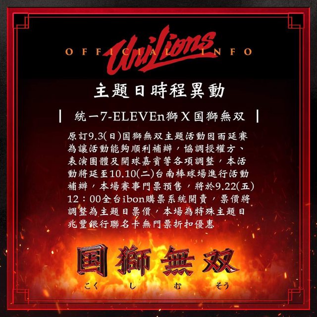 2、原9.3賽事購票者,因該場補賽已非国獅無双主題日賽事,該場補賽票價將調整至假日賽