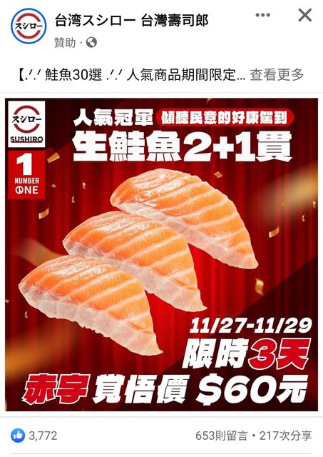 賠本大特價 壽司郎鮭魚壽司三個60元