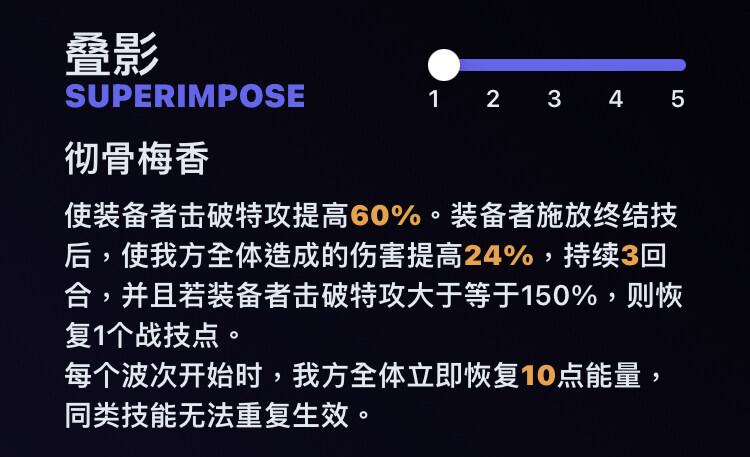 使我方全體傷害提高30%。 擊破敵方目標弱點或攻擊處於弱點擊破狀態的敵方目標後,對
