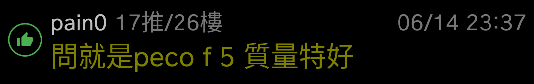 → mHRUed : peco F5我昨天買,很滿意 06/22 20:33