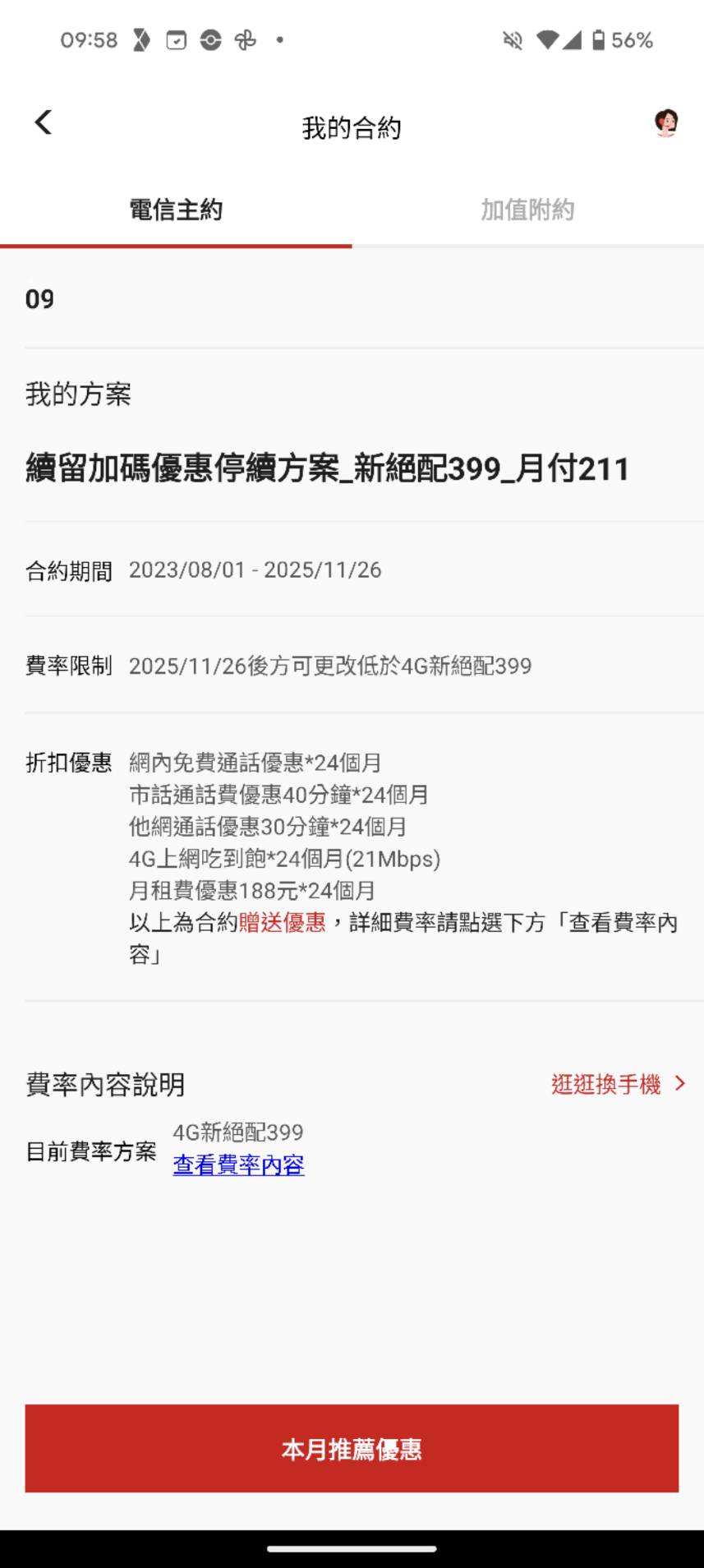 : : 沒約 但系統有幫我自動展延月租211的優惠到2025/12/1